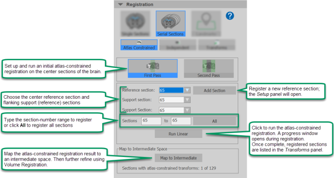 See also Registration windows and tools reference for an overview of the "registration mode" software interface and tools that are available when registering either serial sections or image volumes acquired from unsectioned tissues.