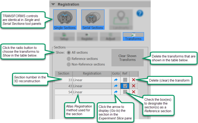 Transforms: View a list of sections that have been registered and manage the resulting transforms. Use the Transforms controls to designate transforms as reference sections for registration of other sections, quickly jump to a section in the Experiment Slice pane of the display, and delete transforms that you want to remove from your results. (This tool is in both the Single and Serial Sections set of tools; see above for details). |