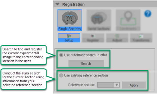 Setup: Tools for initializing registration of the current section by searching the entire atlas or using a previously registered section to inform the atlas search/registration process. |