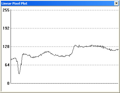 The Linear Pixel Plot window displays a graph of the pixel luminance along a line segment, providing a graphical version of the information displayed in the Pixel Window. You can drag the window to a more convenient area and resize it to view the entire plot.