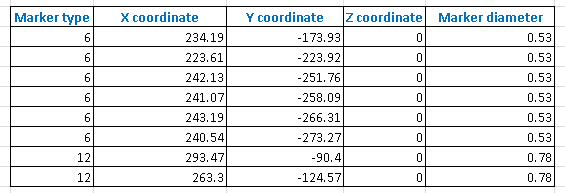 The exported data includes the X, Y, and Z coordinates of the marker location relative to the reference point and the diameter of the marker if intrinsic sizing was used when placing the markers.