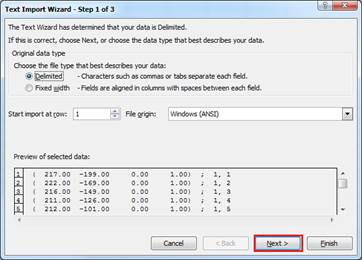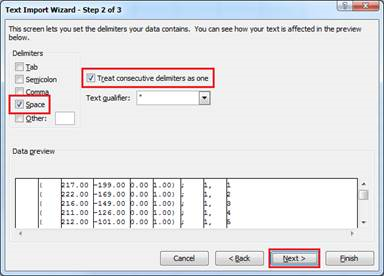 - Select Space as a delimiter, and check Treat consecutive delimiters as one. Click Next, then Finish.