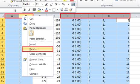 - Hold the Ctrl key and select columns A, B. Right-click and select Delete . Repeat to remove the right 5 columns.
