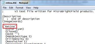 Double-click a contour name to rename it; change the name to something unique (such as "retina"). If you've already traced a contour, click Select Objects, click your ROI contour to select it, right-click and select Change Contour Type. - Save your data file using File>Save As>Data File. Select ASC as the file format.