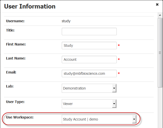 3. In the User Information window, select the name of the new workspace from the Use Workspace drop-down menu and click Update.