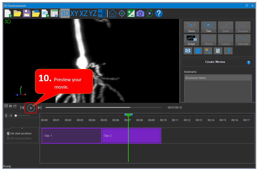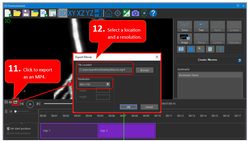 Click the Create Movie button in the 3D environment to create mp4 movies of your images or tracings in Movie mode.