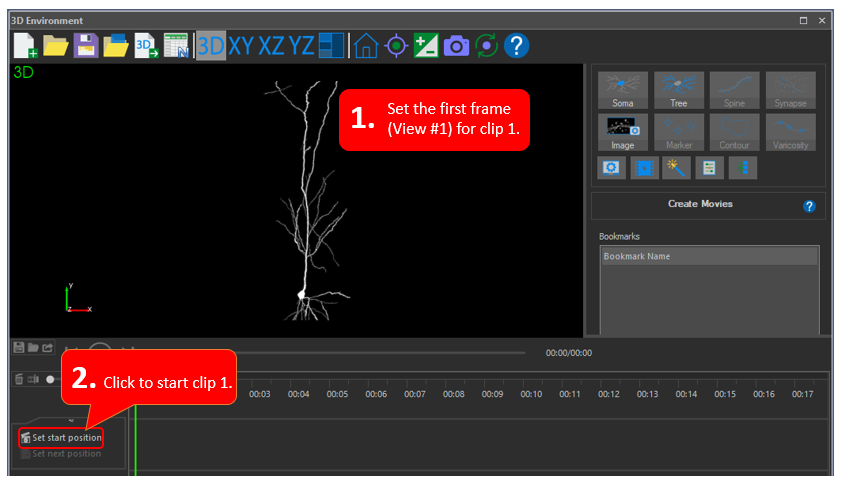 1. Set the first frame in the View by zooming and panning as needed. Here, the first frame is the entire neuron in its original orientation. This is the first thing viewers will see when playing the movie.