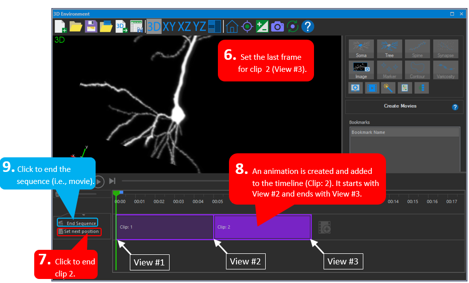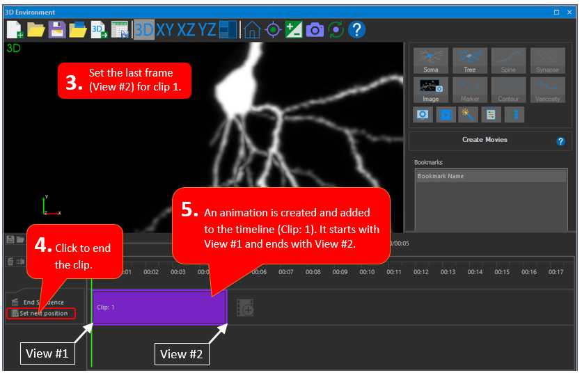 2. Click set next positionin the timeline. An animation is created and added to the timeline (Clip: 1). The animation starts with View 1 and ends with View 2; NeuroInfo software generates the frames between View 1 and View 2.