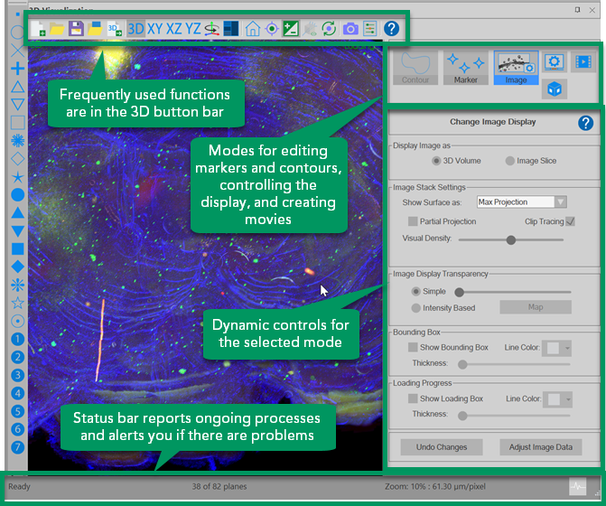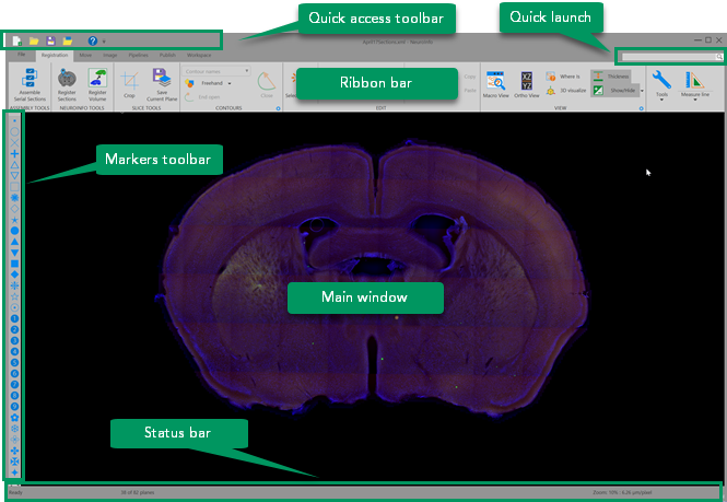 Most of your work will take place in the Main window that opens when you launch NeuroInfo software. You can also view your work in the 3D visualization window. Both are described below.