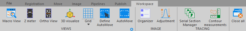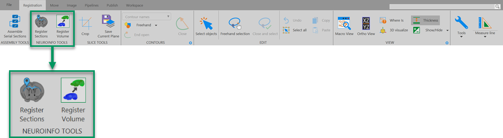 The Registration ribbon includes the NeuroInfo tools group, Register Sections, and Register Volume, the first step in identification of brain regions in your specimens by comparison to anatomical features in a reference-brain atlas. It also contains useful tools—for drawing contours, selecting markers and contours, and measuring.