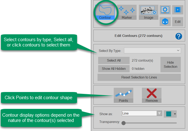 Contours are 2-dimensional shapes that you can create in the main (2D) window to define regions of interest.