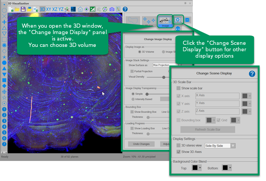 Change Scene Display: Click the button to modify display settings, such as adding scale bars, 3D-stereo effects, and background colors. |