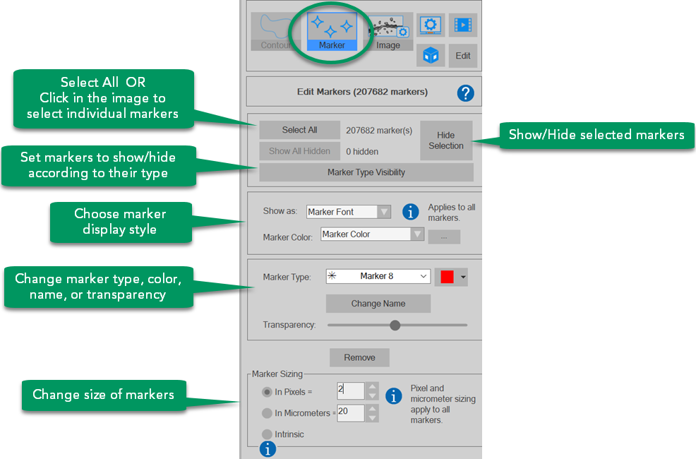 You can edit markers in the main (2D) window or in the 3D visualization window.