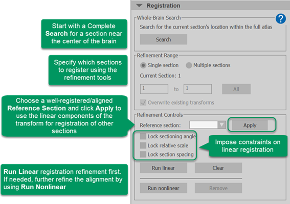 Lock relative scale: Check to use the relative scale (compared to the atlas) identified for the reference section and keep the registration scale parameter constant while running a linear registration.