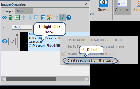 - In the Image Organizer, right-click the stack name then select Create sections from this stack from the right-click menu.