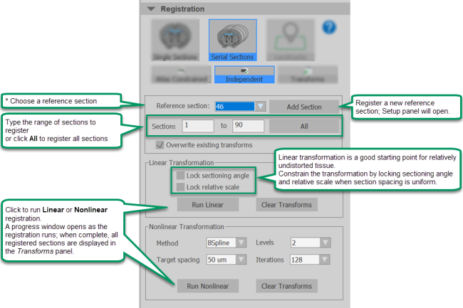 See also Registration windows and tools reference for an overview of the "registration mode" software interface and tools that are available when registering either serial sections or image volumes acquired from unsectioned tissues.