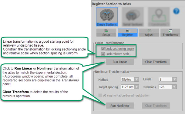 Linear transformation: Applies a uniform set of transformation parameters to the entire section. We recommend trying linear transformation first and evaluating the results.Nonlinear transformation: Applies a transform that is non-uniform across the section. Nonlinear transformation can improve the registration of a section in some cases; we recommend trying it if the results of linear transformation do not meet your expectations.