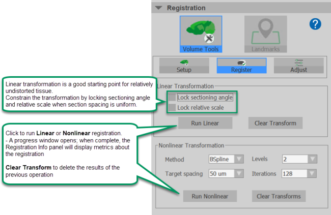 Click Register and refine the 3D brain volume registration by running Linear and/or Nonlinear transformation as follows: