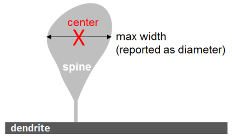Spine head diameter—Maximum width identified between the dendrite and the furthest point on the spine head (taking the shortest path). Spine head center—Center of the segment representing the maximum width identified between the dendrite and the furthest point on the spine head (taking the shortest path) For a spine with a relatively uniform width (e.g., stubby spine), the spine head center is the same as the center of mass.