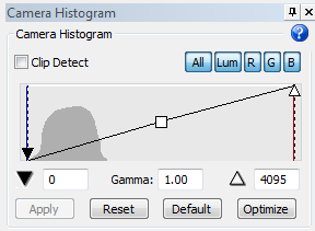 - Select the first channel and adjust exposure time and gain until the histogram displays the most dynamic range possible.