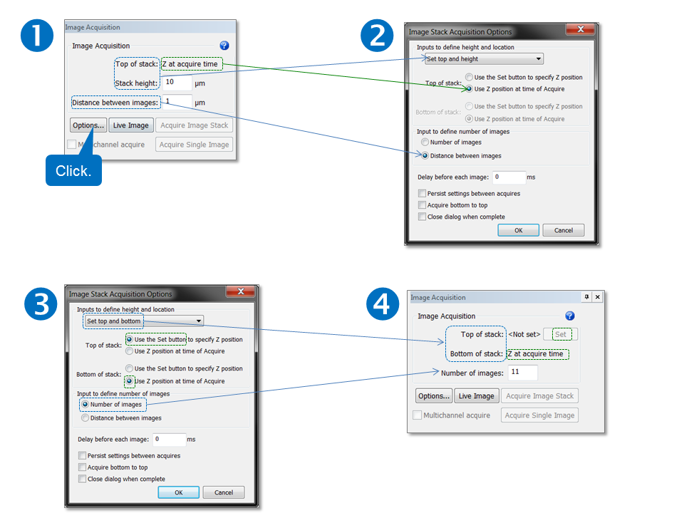 - Inputs to define height and location: Select Use Z position at time of acquire ONLY if you've already focused to the top of the stack to be captured (if you are not focused at the top, the objective could hit the slide).