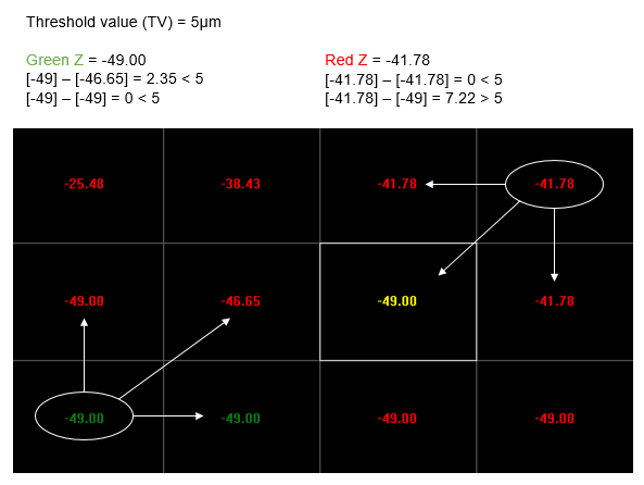 - Green represents Z where the difference between Green Z and Z from each adjacent site is less than the threshold value you defined.