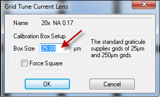Enter the box size corresponding to the grid you're using:- 10X and lower: 250 µm