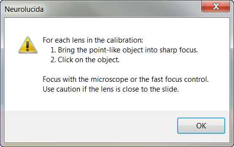 - An alert is displayed. This is a reminder that, for each lens, you need to click the EXACT SAME POINT on the grid, regardless of where it appears on the screen.