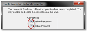 Once all lenses have been calibrated, the Enable Parcentric Parfocal Corrections window appears.