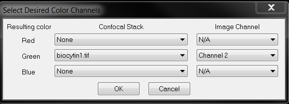 - Select all desired image files from the Open Image Stack dialog box. The Select Desired Color Channelsdialog box appears.