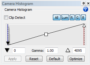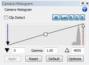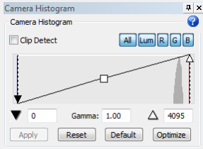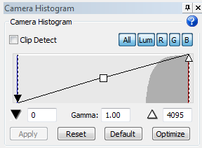 The red line on the right of the graph indicates saturation. If the image is completely saturated, the function (represented in gray) is not visible; only the red line appears. If enabled, Clip Detect will show most of the image as red.