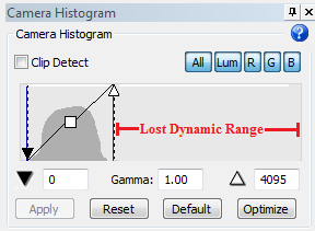 To improve the dynamic range, you may move the white point slider to the left (see figure on the left). This may give the illusion of a better image. However, most of the dynamic range is lost (see 2nd histogram) and the signal-to-noise ratio is lower. |