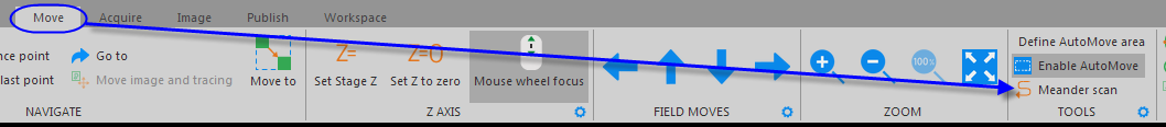 Meander Scan is an automated scanning procedure used to ensure that all points within a closed contour are viewed by moving systematically through the contour.