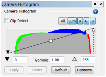 The camera histogram displays a graphical representation of the dynamic range (visual brightness and contrast) of the live image. It will vary from camera to camera, depending on the driver used and the features supported by the camera.