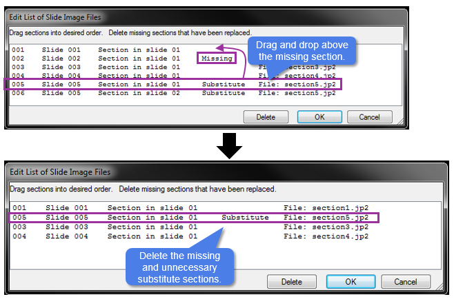 - Select the replacement section in the list (labeled Substitute) and drag it over the section to be replaced (labeled Missing).