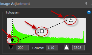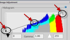 2. Check Apply changes to stack then adjust brightness and contrast by adjusting gamma, black point and white point in the histogram: Drag the white square, black triangle and white triangle respectively.