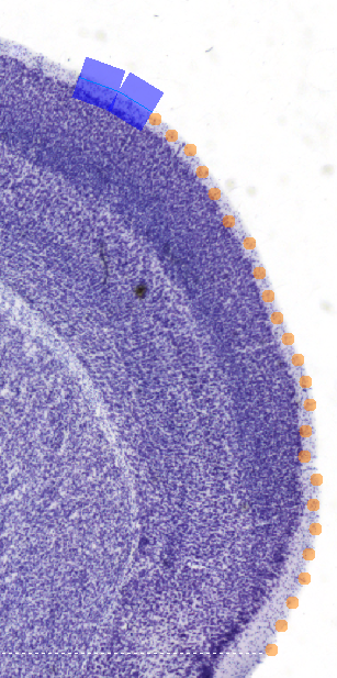 - Place two contour points manually. Vesselucida 360 highlights the segments between the contour points in blue and suggests a path for the next contour points represented by orange circles.
