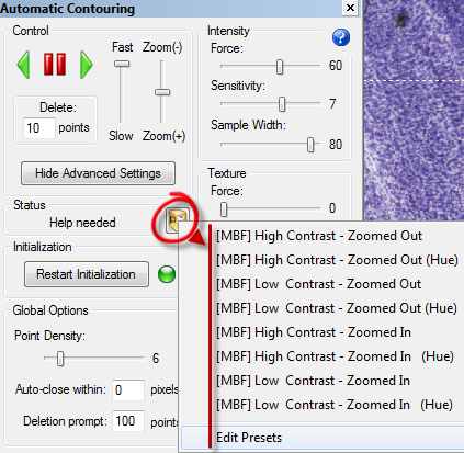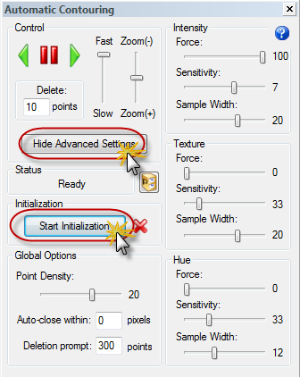 Sensitivity: Controls when automatic contouring needs to stop and ask you for help—you will need to examine the tracing and make some decisions. A lower Sensitivity value requires less interaction, but it is more likely to wander into undesirable image areas.