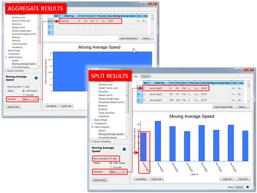 - The split results show the moving speed averaged for each period of time corresponding to the recurring label.