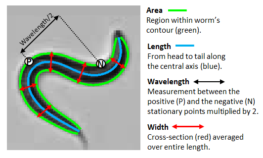 - Absolute peristaltic length: Length of forward motion + length of reverse motion (red) over the total number of frames tracked.